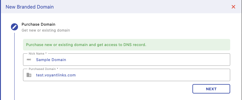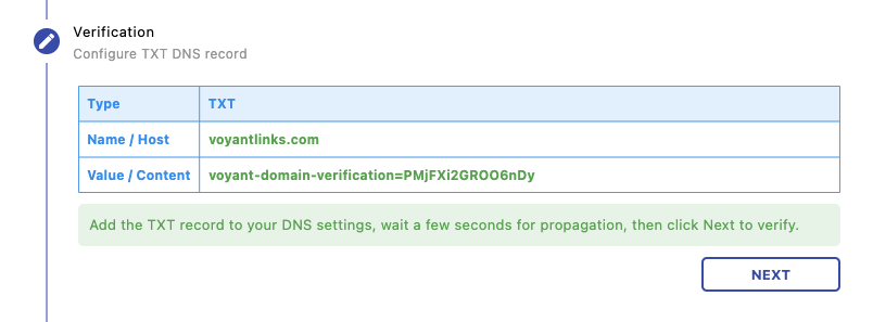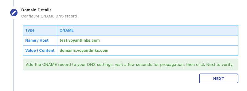 Go to your domain provider’s DNS settings and add the CNAME record shown. This connects your domain with Voyant’s infrastructure so links can be resolved correctly.