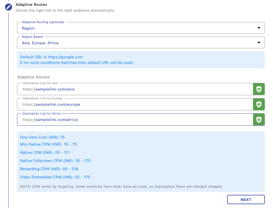 Dynamically route users to different destinations based on conditions like region. If no condition matches, a default URL is used. This is useful for localized campaigns.