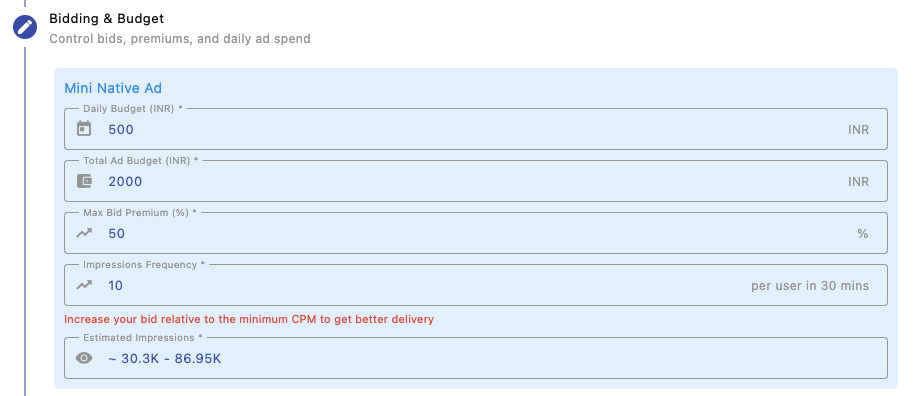 Bid Premium (%) allows you to increase your bid above the base CPM to improve delivery and win more impressions. Higher premiums increase visibility and reach, especially in competitive segments, but may also increase overall spend.