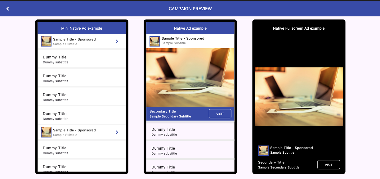 Preview how your ads will look across different formats like mini native, native, and fullscreen. This helps ensure your creatives look good before launching.