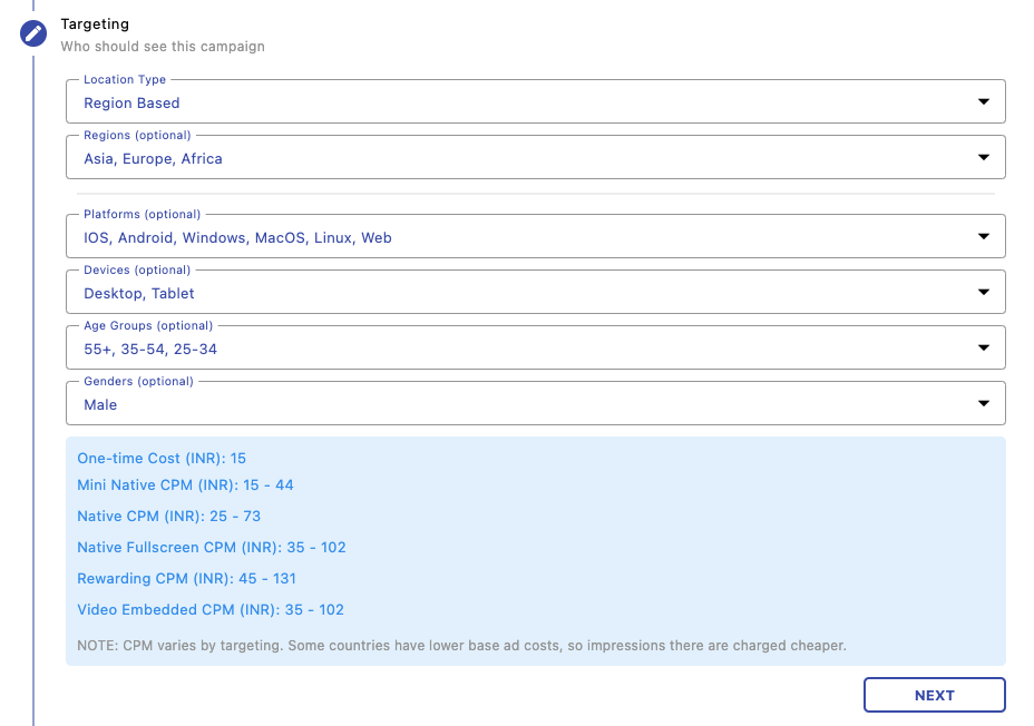 Select your audience using filters like location, platform, device, age group, and gender. This ensures your ads are shown to the most relevant users for better engagement.