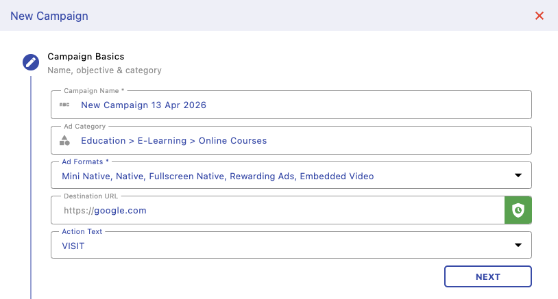 Define your campaign name, category, ad formats, destination URL, and call-to-action. This sets the foundation of your campaign and determines how your ads will appear to users.
