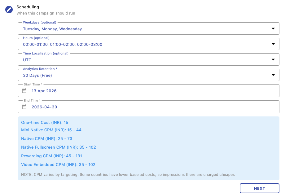 Control when your campaign runs by selecting specific days, time slots, and time zones. This helps optimize delivery during high-performing periods.