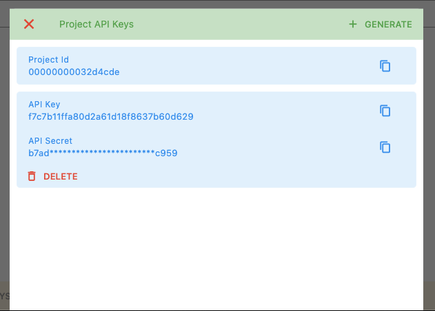 Manage your credentials including Project ID, API Key, and API Secret used for authentication.