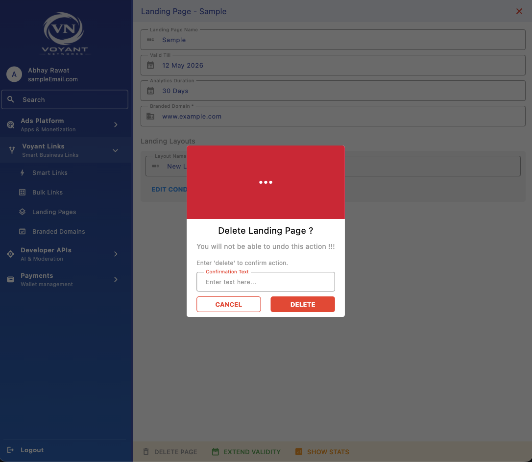 Manage your landing pages after creation - extend validity, delete pages, and control how your branded domain behaves over time. These actions help you maintain active campaigns and handle lifecycle changes efficiently.