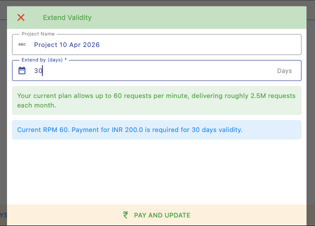 Extend your project’s validity to continue using the API without interruption. Pricing is based on your selected RPM plan and duration.