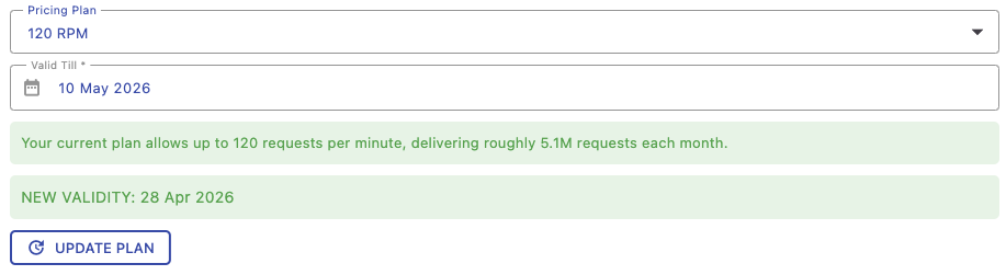 View and manage your current pricing plan, request limits, and project validity. You can upgrade your plan anytime to increase request capacity and handle higher traffic.