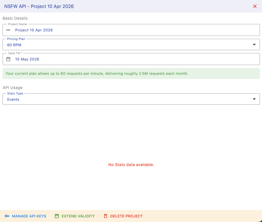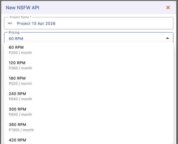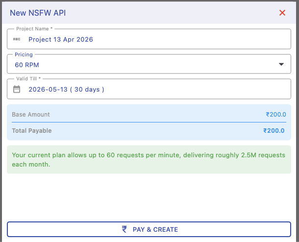Create your project by assigning a name, selecting a pricing plan, and setting validity duration. Pricing is based on requests per minute (RPM), allowing you to scale based on usage needs.