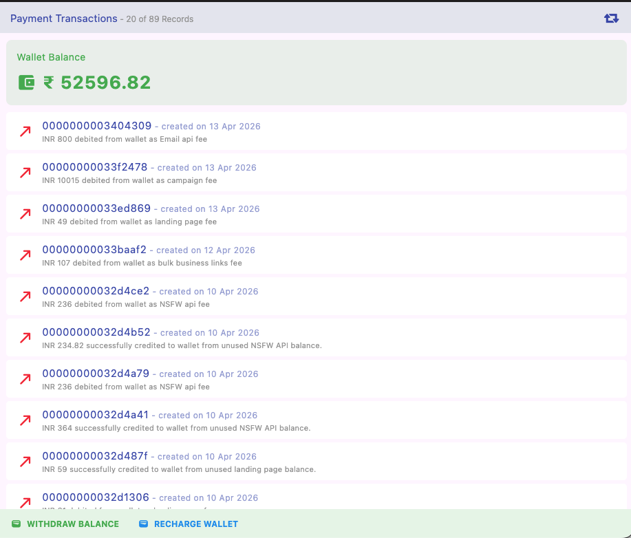 • Debits → Charges for campaigns, APIs, landing pages